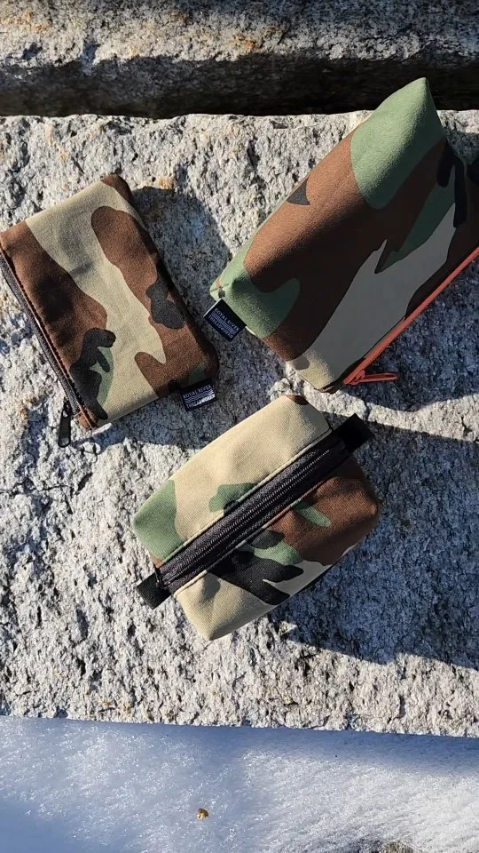 Each organizer is made with Olive Drab 10oz Canvas for durability. The smaller flat pouch and utility pouches are single-layer, unlined. The larger two standing pouches are double-layered and lined with Blaze Orange 10oz Canvas.